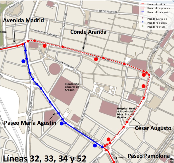 Con motivo de la celebración del Desfile de Carnaval en la Avenida César Augusto, previsto para el sábado 14 de febrero entre las 16:30 y las 22:00 horas, las líneas 32, 33, 34 y 52 realizarán los siguientes desvíos: