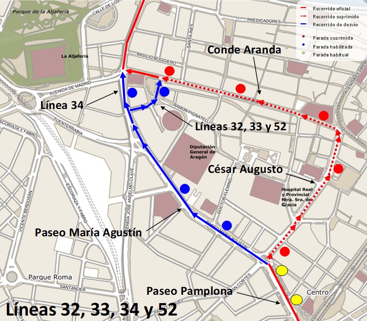 Sentido Portillo: Desde Paseo Pamplona/Puerta del Carmen por Paseo María Agustín, Marie Curie a Conde Aranda. La línea 34 continuará desde Paseo María Agustín a Paseo María Agustín.