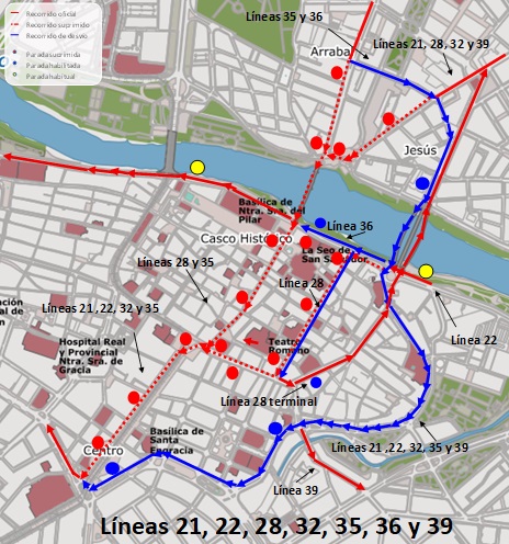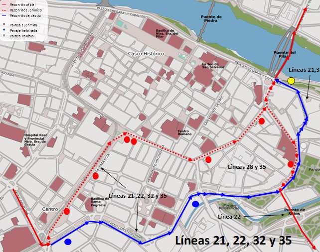 La línea 28 se desviará desde Avd. Cataluña, Muel, Pte. del Pilar, San V. de Paul a Coso 126 (terminal).
