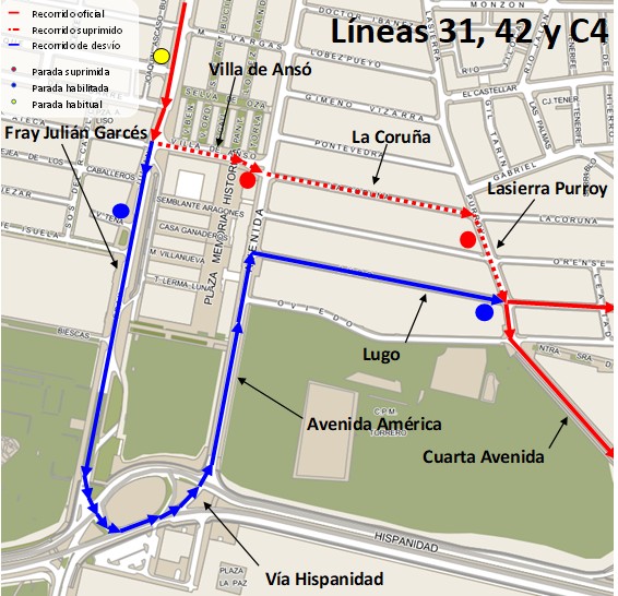 Líneas 31, 42 y C4: Desde Fray Julián Garcés por Fray Julián Garcés, Vía Hispanidad, Avenida América, Lugo a sus recorridos oficiales.
