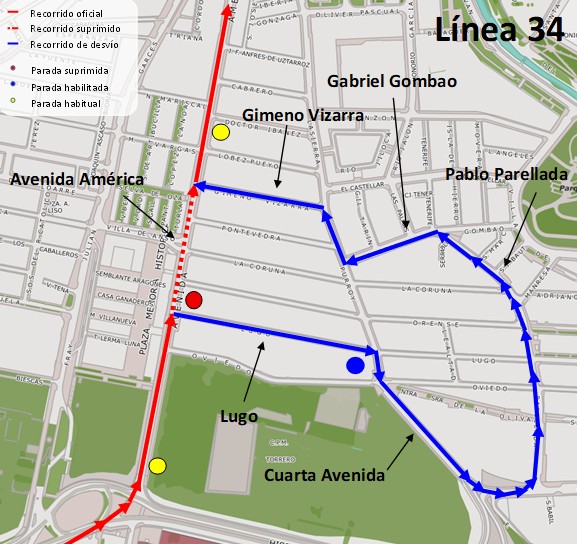 Línea 34: Desde Avenida América por Lugo, Lasierra Purroy, Cuarta Avenida, Pablo Parellada, Gombao, Lasierra Purroy, Hermanos Gimeno Vizarra a la Avenida América.