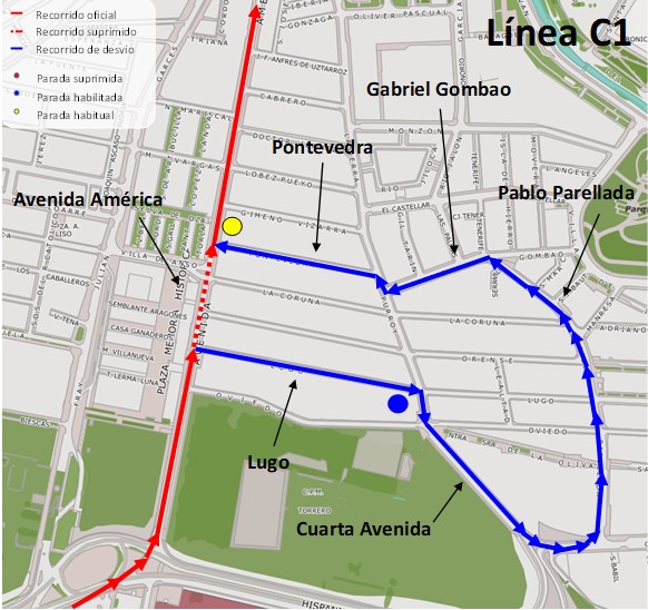 Línea C1: Desde Avenida América por Lugo, Lasierra Purroy, Cuarta Avenida, Pablo Parellada, Gombao, Lasierra Purroy, Pontevedra a la Avenida América.