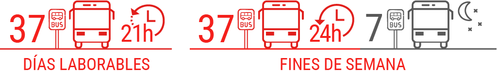 37 líneas diurnas dan servicio durante más de 21 horas en días laborables. En fin de semana el servicio se amplía dando cobertura las 24h con 7 líneas nocturnas.
