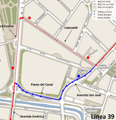Debido a trabajos de desmontaje de unas antenas en la calle Lapuyade, la Línea 39 irá desviada por Av. San José, Pº Canal a la Av. América entre las 08:00 y las 22:00 horas del día 18 de enero.