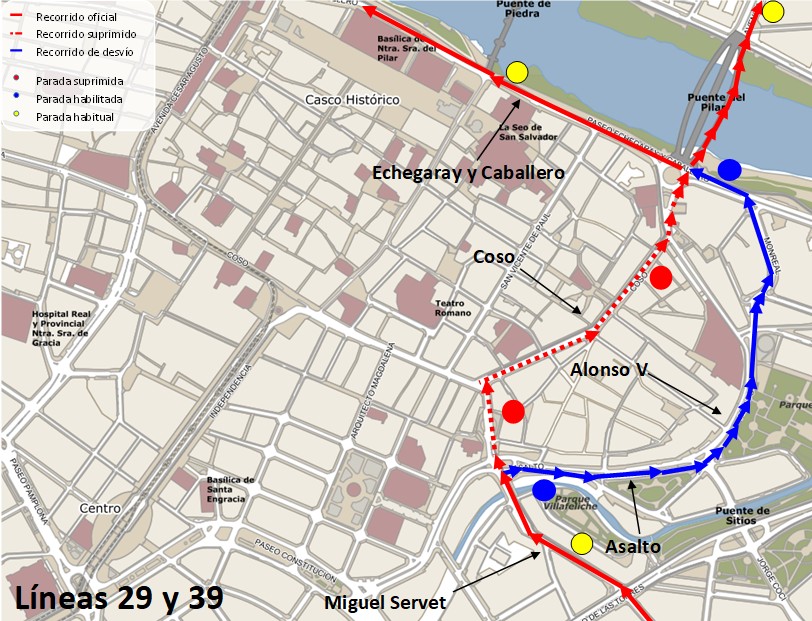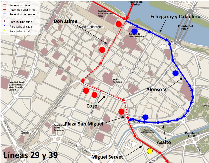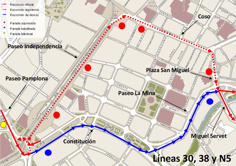 Debido a los trabajos por la reforma del Coso y Plaza San Miguel, previstos desde el lunes 20 de octubre hasta finalización de los mismos (durará meses), las líneas 29, 30, 38, 39, 40 y N5 realizarán los siguientes desvíos: