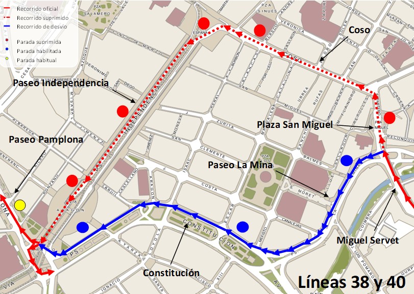 Líneas 38 y 40 sentido Plaza Paraíso: desde Miguel Servet por Mina, Constitución a sus recorridos oficiales.