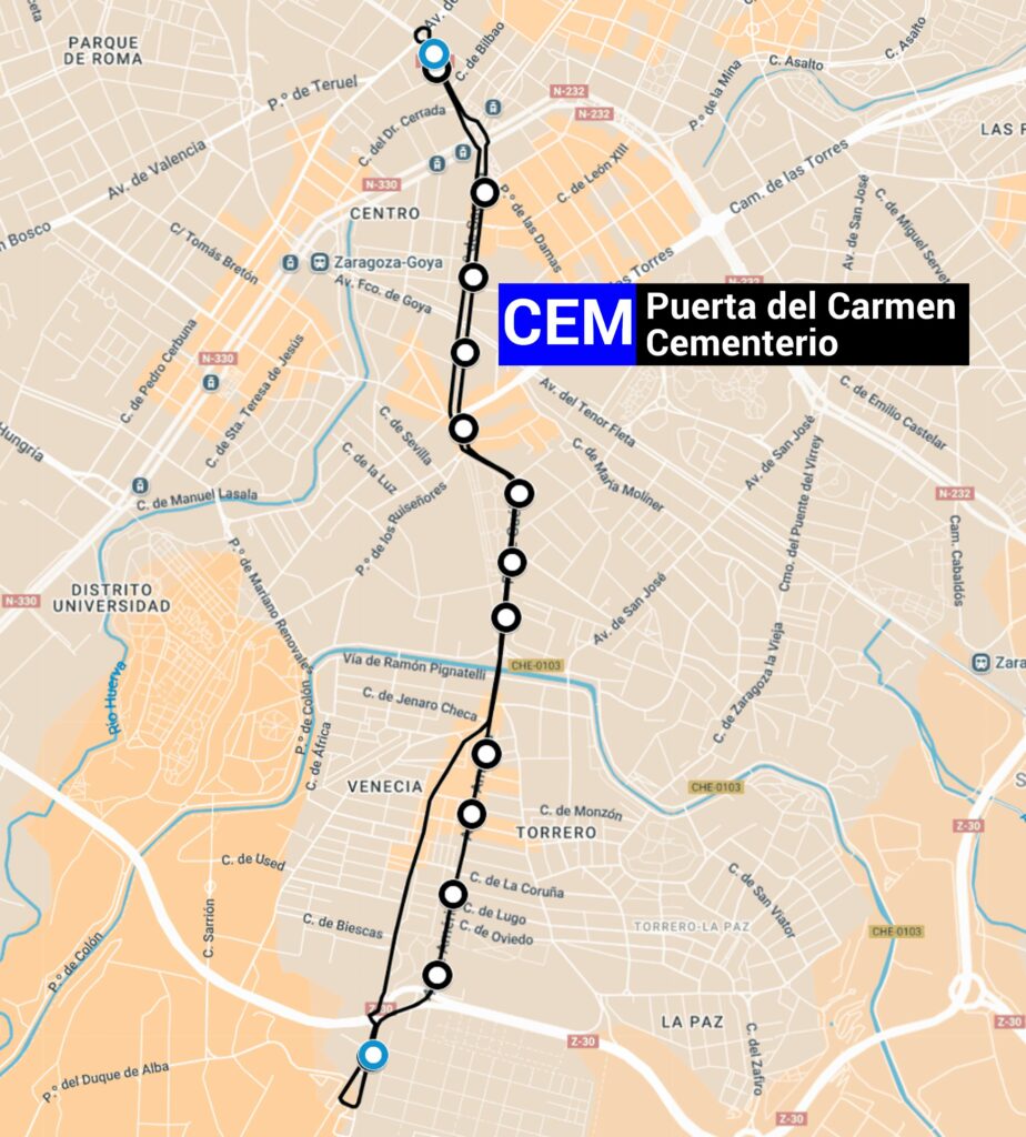 Línea CEM: Su recorrido será de Puerta del Carmen al Cementerio de Zaragoza. Prestará servicio el 1 de noviembre con una frecuencia media de 20 minutos aproximadamente y prestará servicio de 7:15 a 15:00 horas.