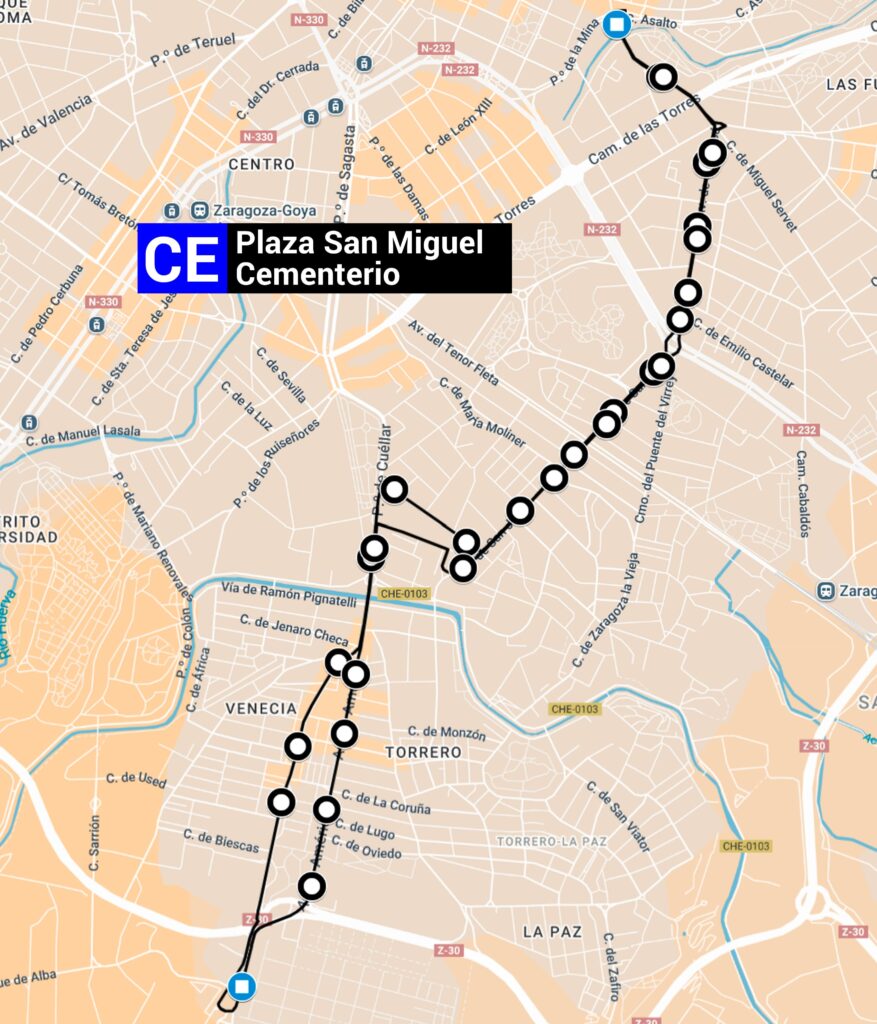 • Recorrido sentido Cementerio: desde Miguel Servet con Paseo La Mina por Miguel Servet, Avenida San José, Lapuyade, Paseo Cuellar, Fray Julián Garcés, Cementerio.