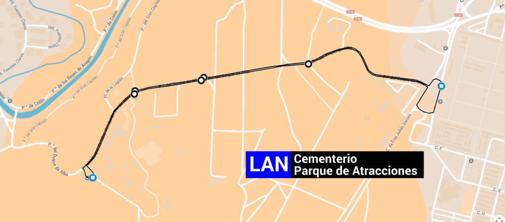 Línea LAN: Su recorrido es del Cementerio de Zaragoza al Parque de Atracciones. Prestará servicio el 1 y 2 de noviembre con una frecuencia media de 20 minutos y prestará servicio desde la apertura al cierre del Parque de Atracciones, de 10:36 a 21:06 horas.