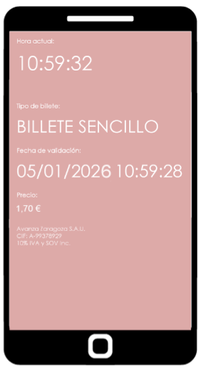 - Se compra desde la aplicación Avanza Zaragoza disponible para Android e iOS. Puedes comprarlo con antelación ya que no caduca. Para utilizarlo tendrás que escanear el QR de la mampara del conductor y el billete pasará a estado «validado» como en la imagen.
